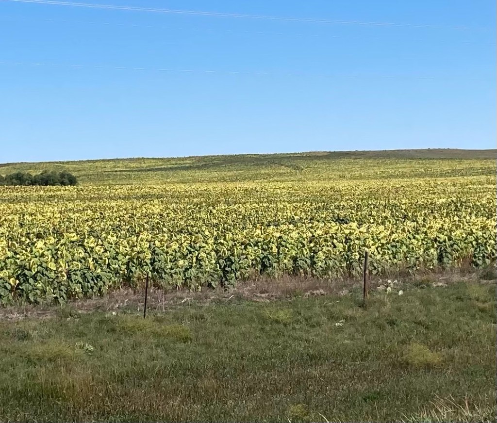 Farm report. We did not see any irrigation equipment today. There were a couple of cornfields with short stalks of corn. We saw two giant fields of sunflowers.
