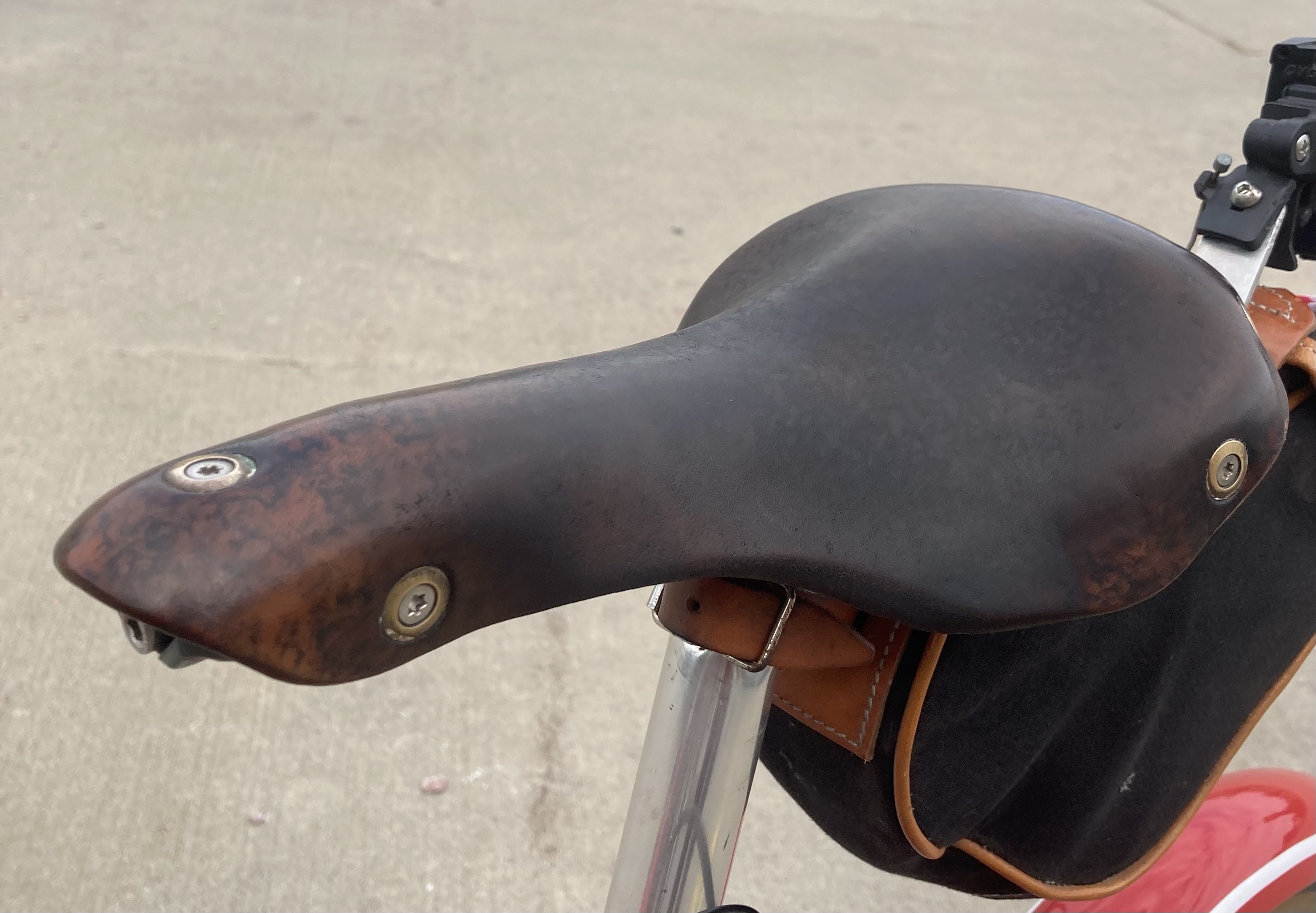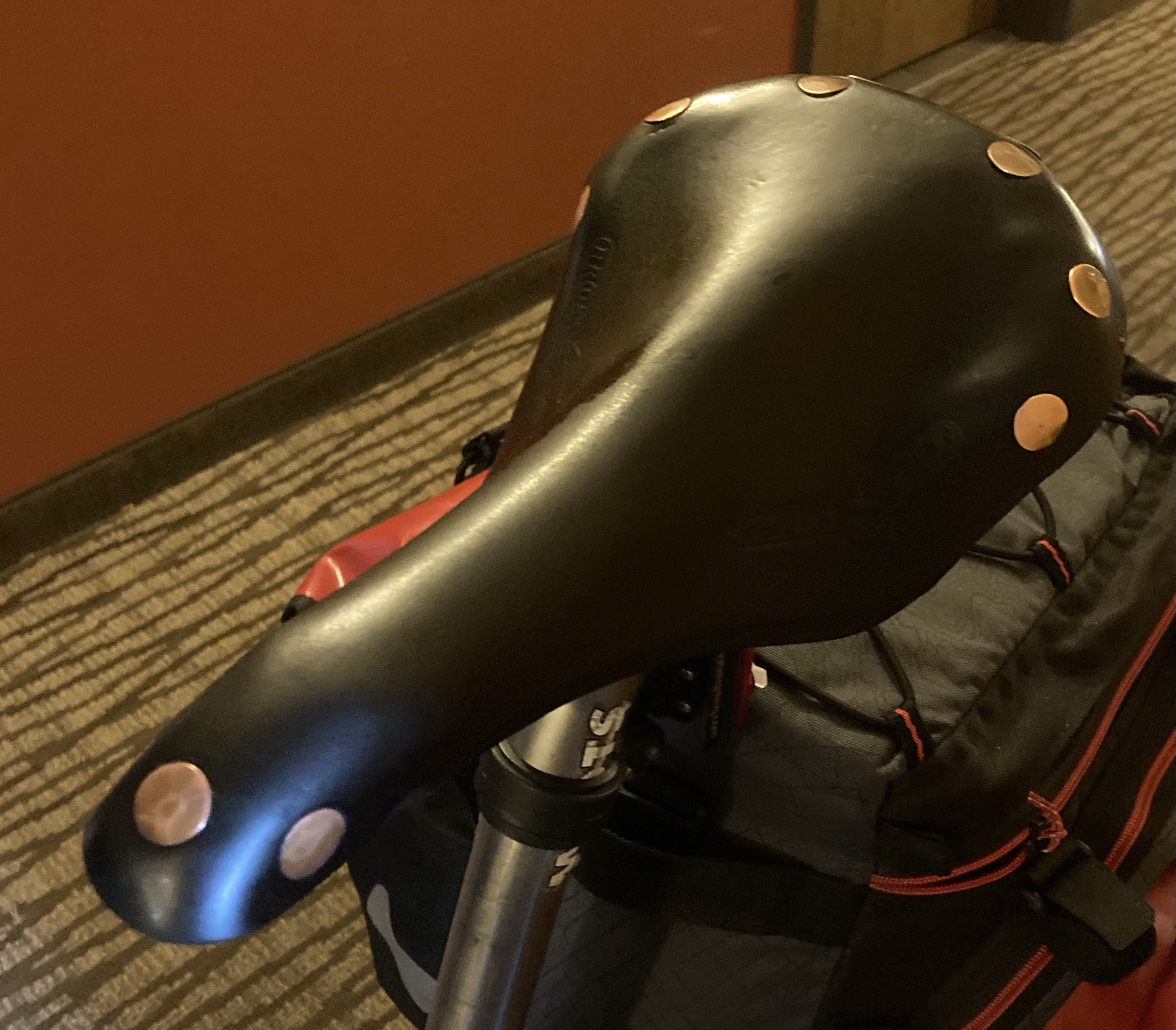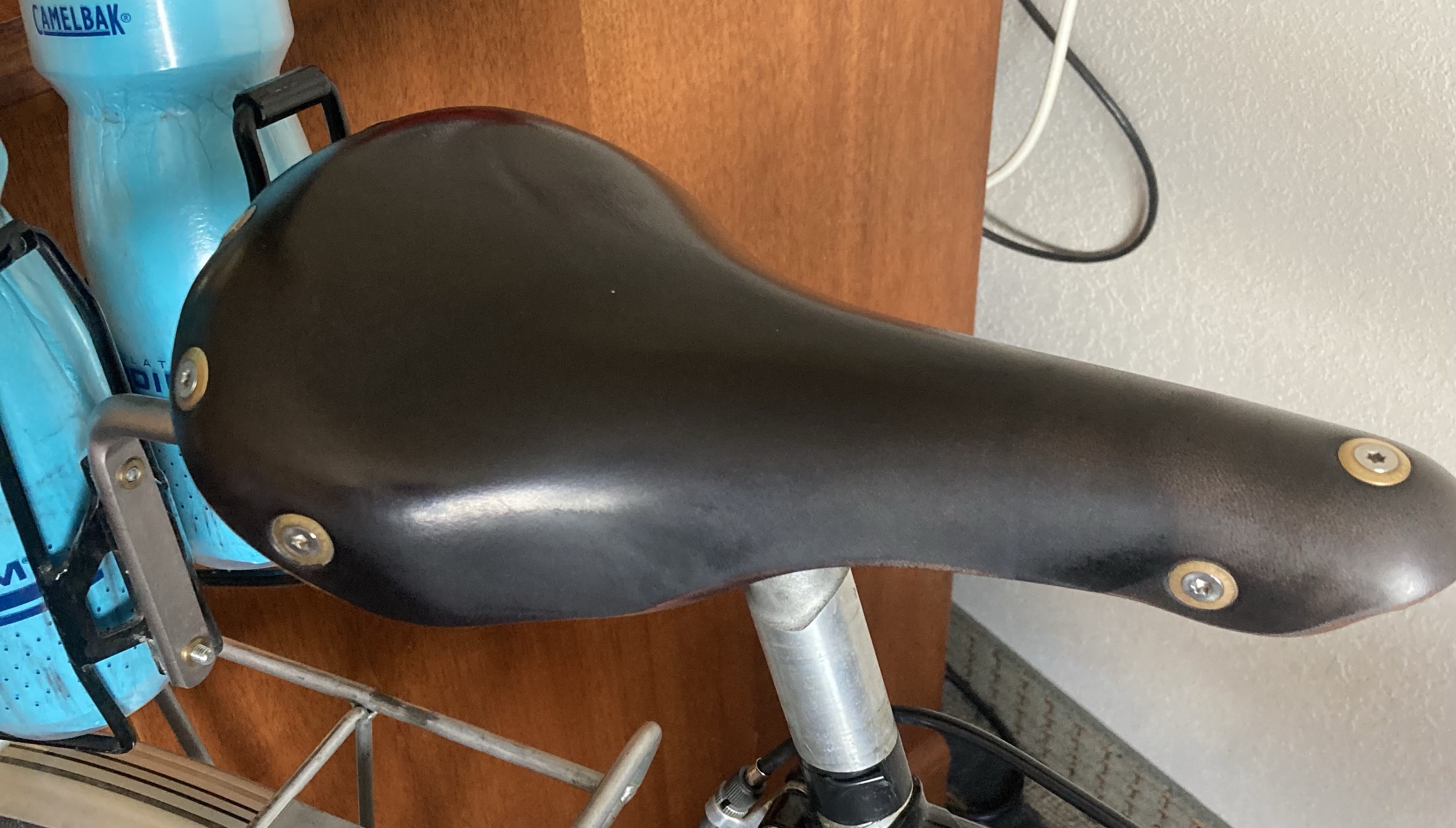 We don’t agree on too many things but all four of us are riding on leather saddles. The modern leather saddle has taken about 150 years to develop. The long narrow shape allows us to spin our legs at high rpms. A wider platform would interfere with our thighs. The back of the seat is just broad enough to support the pelvis and just padded enough to absorb impacts without adding weight. The leather is suspended on rails that help to absorb bumps. The long top lets us scoot around to control the bike or shift our weight to rest our butts.
