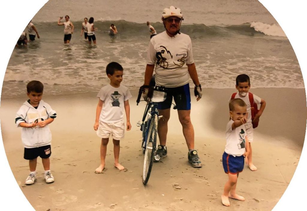 Dad finished his 3,200 mile cross country ride in Rehoboth Beach, Delaware. Our brother Willie was living in Schenectady, New York at the time so he came down to Rehoboth Beach. We were in Pittsburgh and took Mom over. It was drizzling when they rolled into town. Dad and some of his grandkids posed for a photo on the beach.