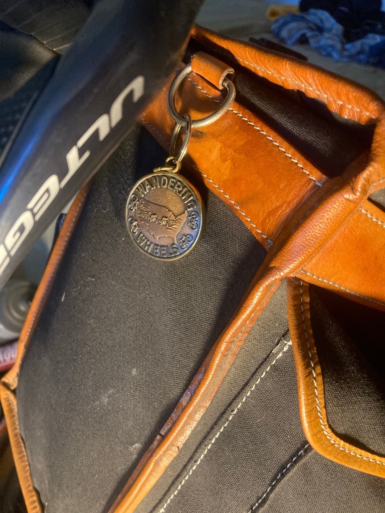 Wandering Wheels gave the riders a small medal sometime after the conclusion of the ride. Twenty-five years later the medal has been going along on our adventure attached to the side of my handlebar bag.