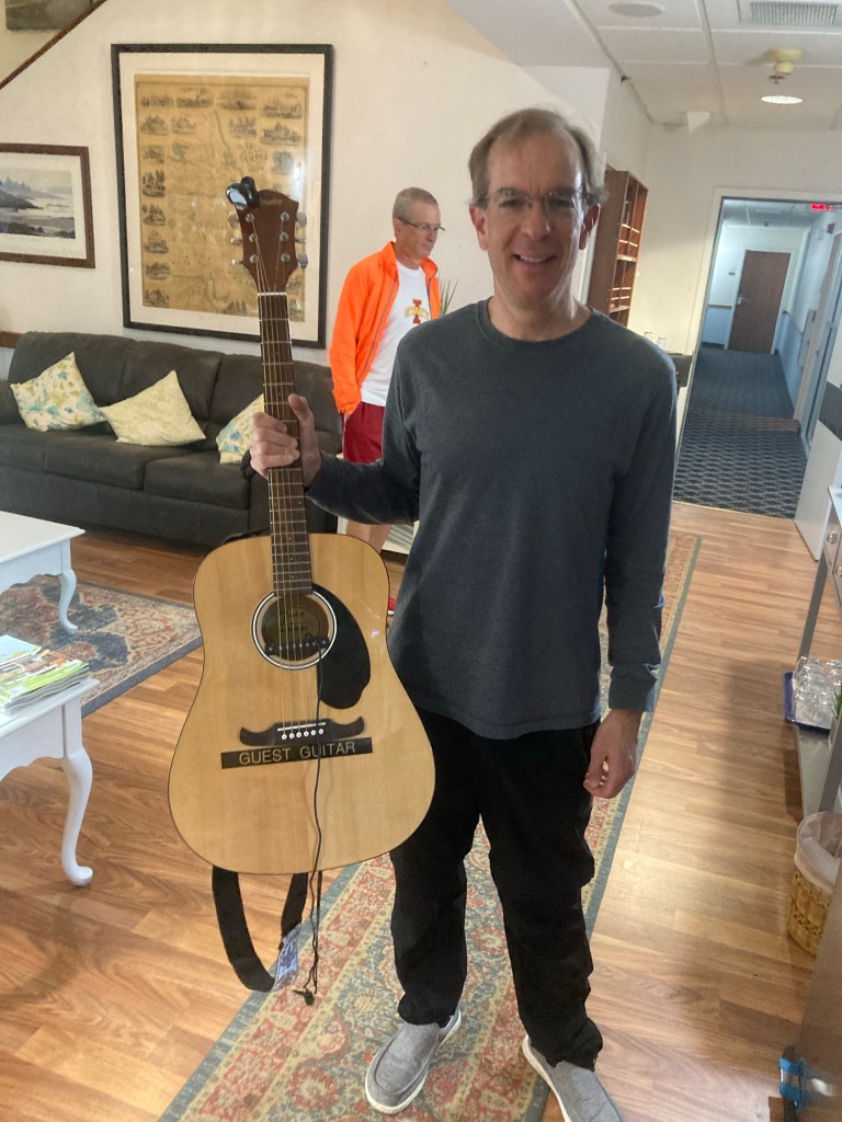 The hotel had a guest guitar which Chad played in the garden before dinner. He is out busking on the bridge now.